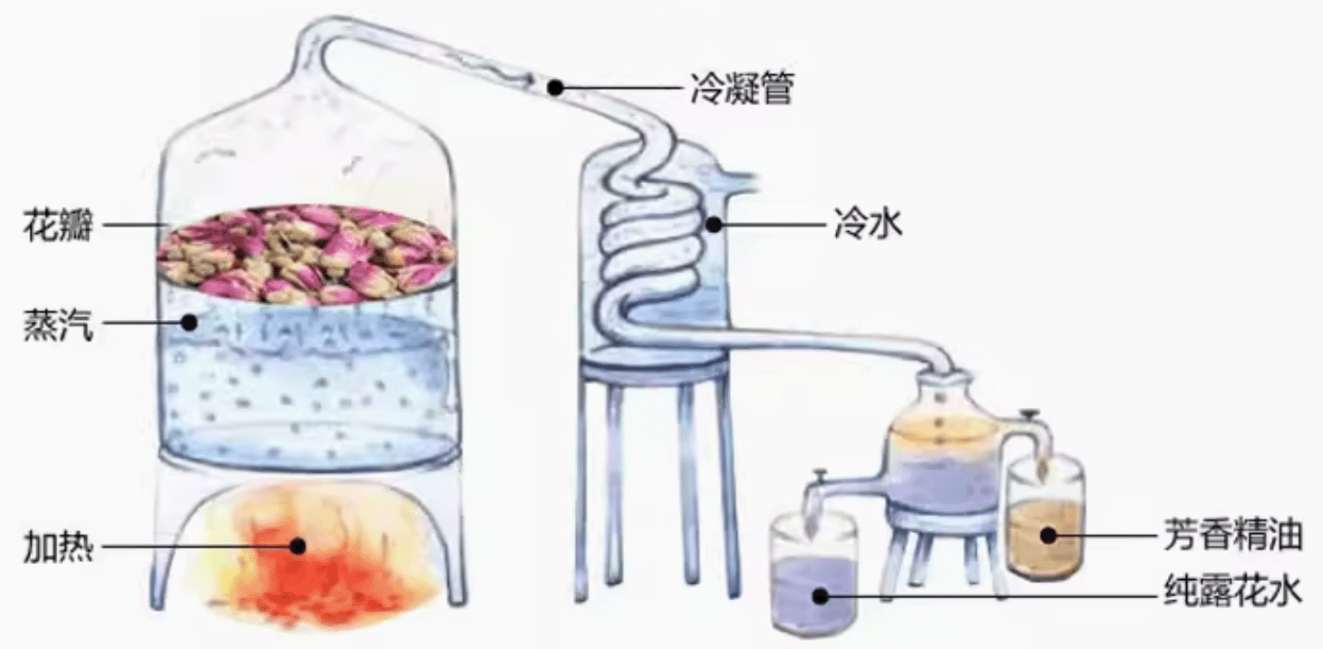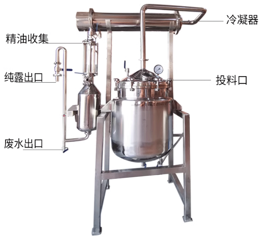 的不銹鋼蒸餾容器(蒸餾器),在容器底部加熱或通入蒸汽。當(dāng)炙熱的蒸氣充滿在容器里,會(huì)將植物內(nèi)存的芳香精油成分隨著水蒸氣蒸發(fā),并且隨著水蒸氣通過上方
