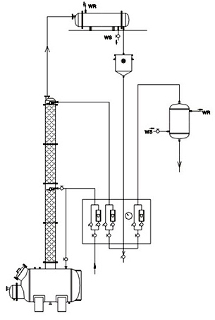 本裝置采用高效不銹鋼波紋填料,接觸酒精部位,如塔體、冷凝器、穩(wěn)壓罐、冷卻蛇等均采用優(yōu)質不銹鋼制作,成品酒精不被污染,塔釜采